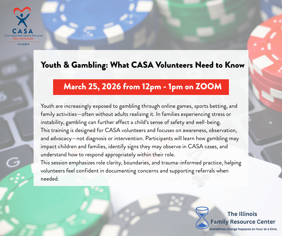 This training is designed for CASA volunteers and focuses on awareness, observation, and advocacy—not diagnosis or intervention. Participants will learn how gambling may impact children and families, identify signs they may observe in CASA cases, and understand how to respond appropriately within their role.